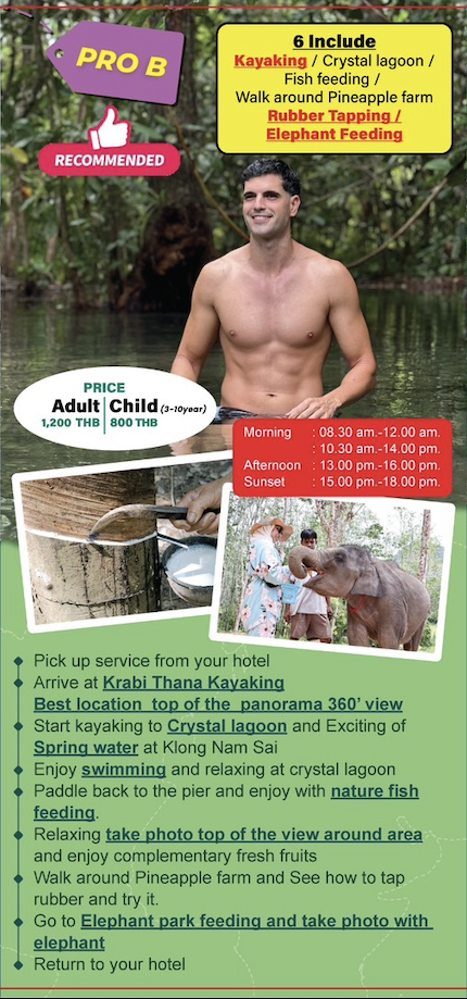 • 6 Include = 1.Kayaking 2.Crystal Lagoon 3.Fish Feeding 4.Walk around Pineapple farm 5.Rubber Tapping